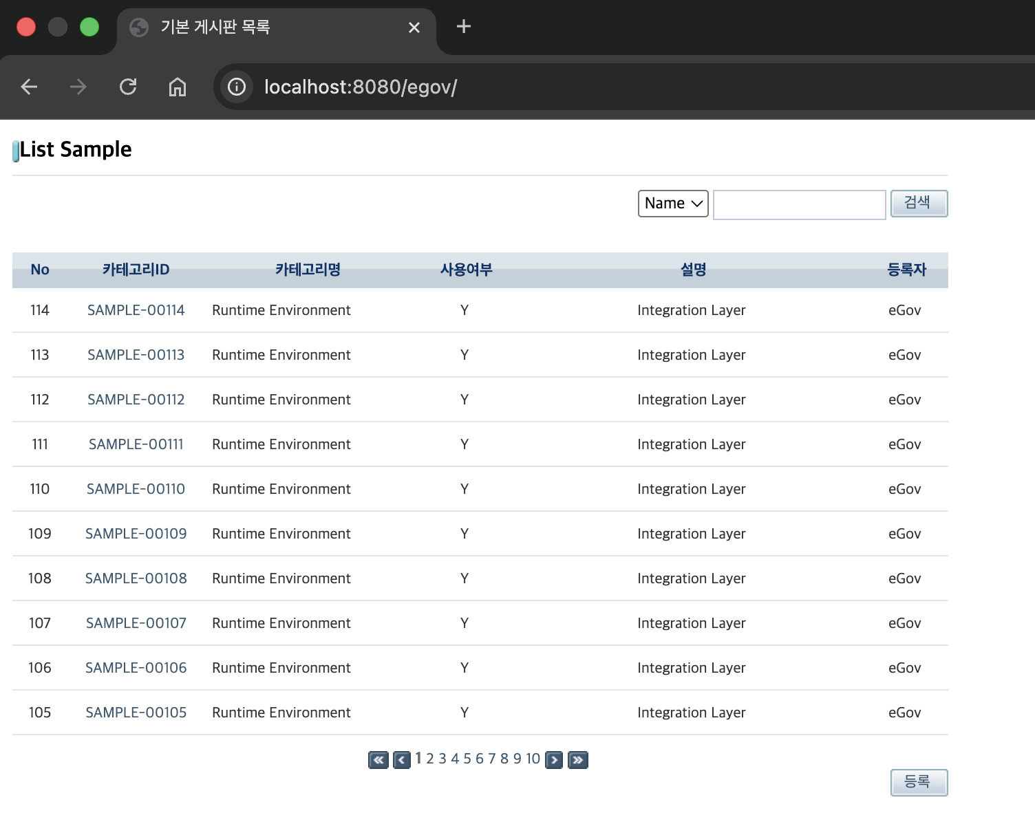 브라우저에서 http://localhost:8080/egov/ 주소로 접속하면 표준프레임워크에서 제공하는 기본 게시판(List Sample) 화면이 나타납니다.