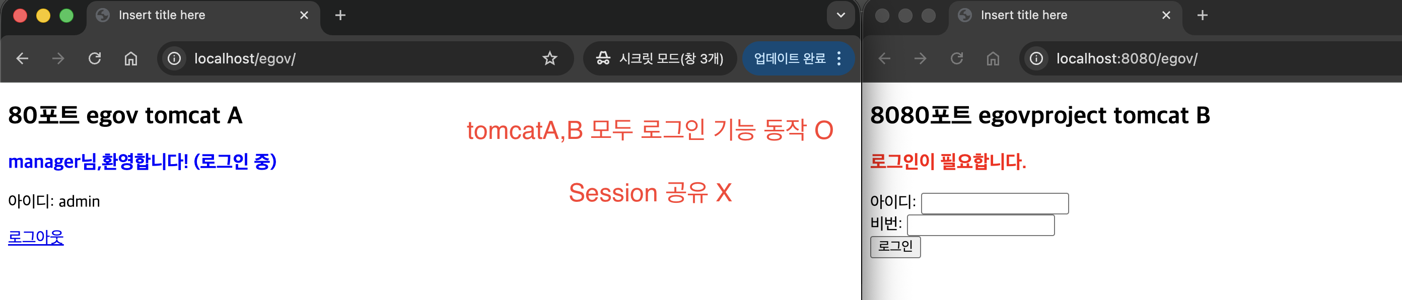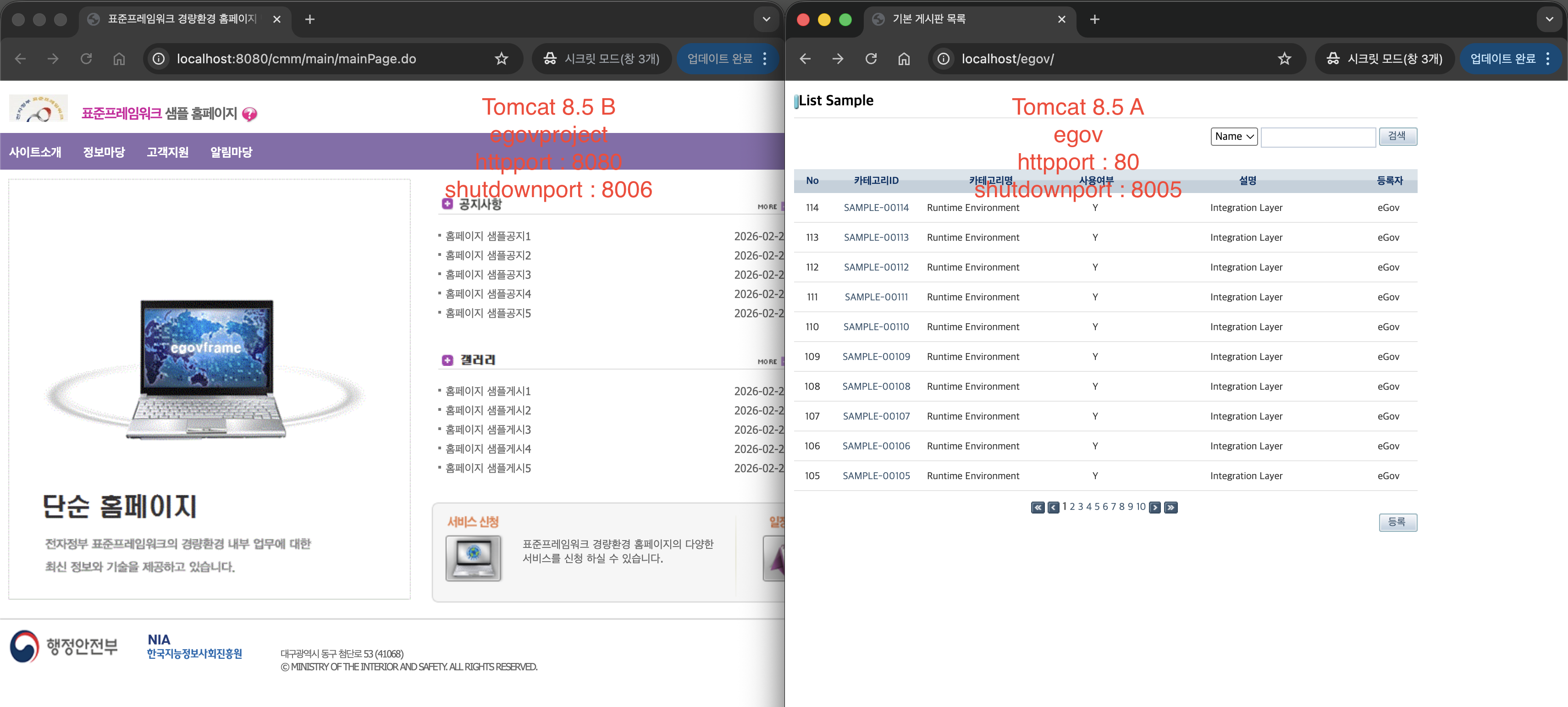 - Tomcat B: HTTP 포트 8080 / 8006(Shutdown) 사용 / dopal2.egovproject 서비스