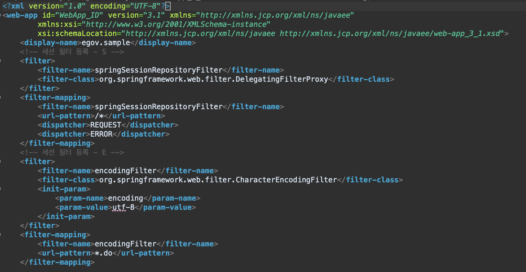 그리고 필터를 설정해야합니다. 기존에는 tomcat과 session을 설정했지만 DB와 세션을 설정하기 때문에 web.xml에 필터를 추가해야합니다. 그리고 encodingFilter보다 먼저 실행되어야 한다고 해서 그 위에 추가했습니다.