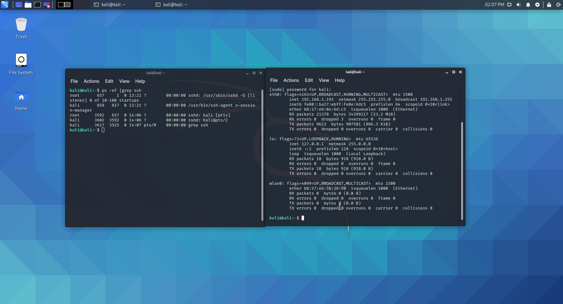 ps -ef를 통해서 ssh를 확인, ifconfig를 통해서 라즈베리파이가 접속된 IP를 체크한다.
