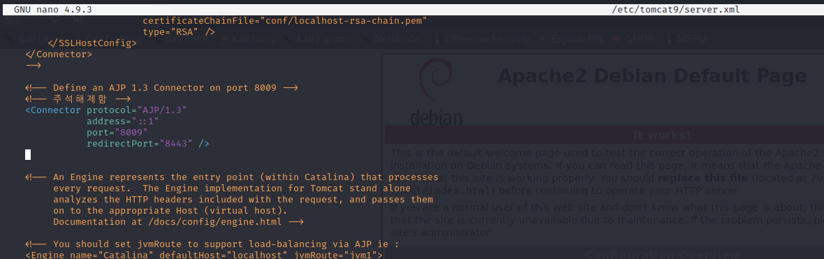 톰캣의 server.xml에서 ajp 에 관련된 부분의 주석해제한다.