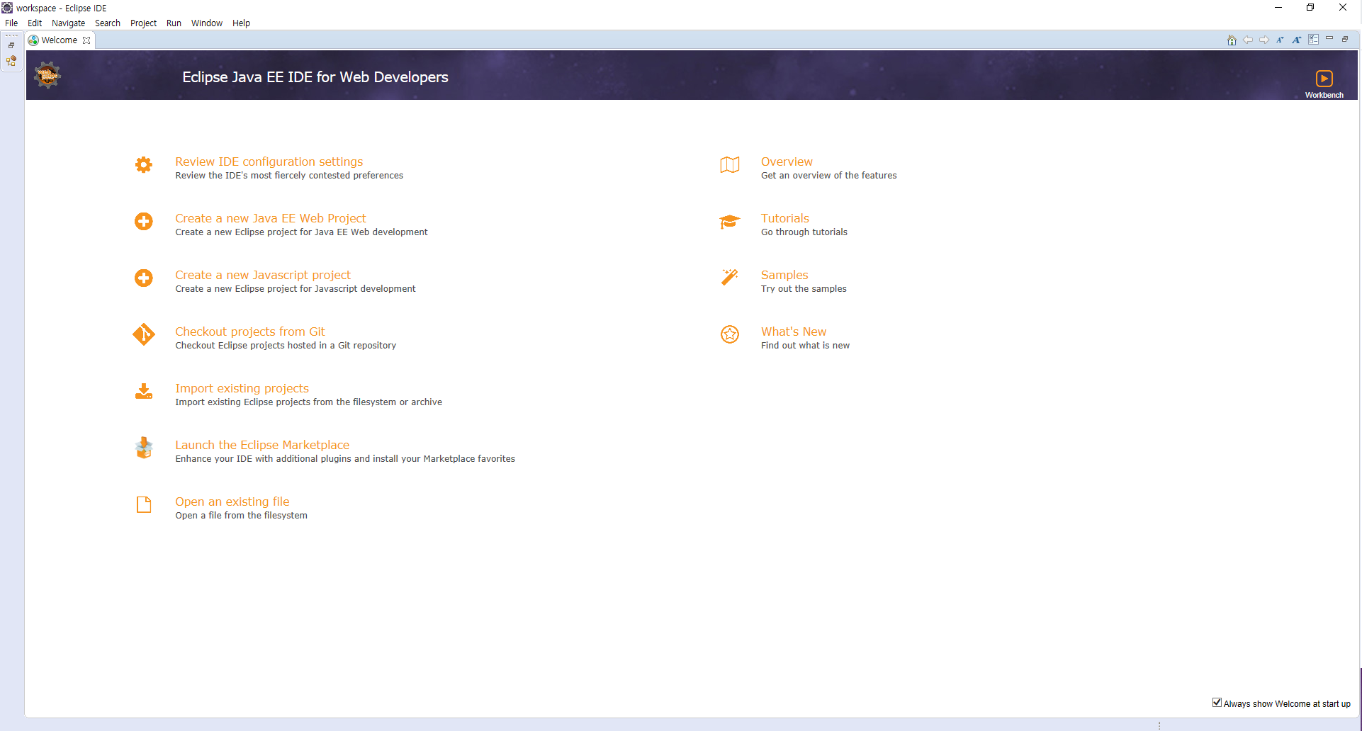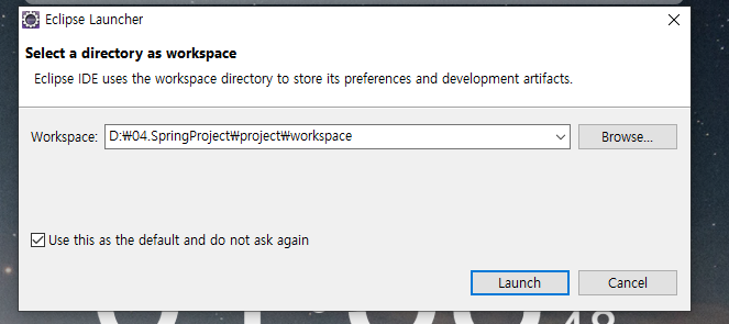 실행시 workspace 설정을 D://04.SpringProject/project/workspace로 선택하여 실행