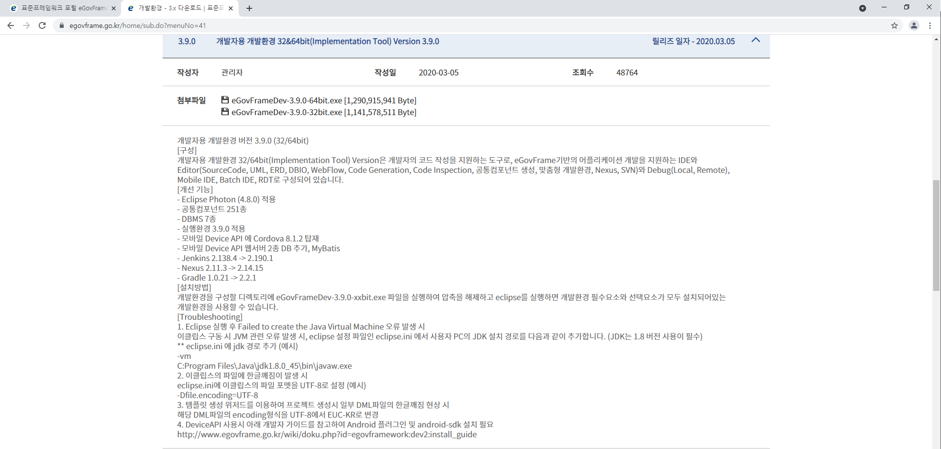 개발자용 개발환경 32&64bit(Implementation Tool) Version 3.9.0 에서 64bit 다운로드