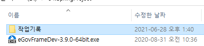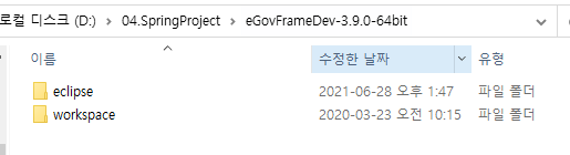 압축해제시 egovframework3.9 디렉터리가 생성되고 디렉터리 내에 eclipse, workspace 디렉터리가 생성된다.