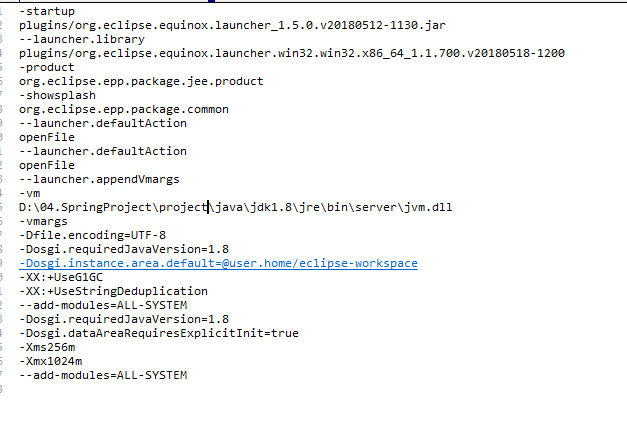 설치후 해당 eclipse 디렉터리의 eclipse.ini 파일을 수정(ex. D://04.SpringProject/project/eclipse/eclipse.ini, 편의를 위하여 egovframe디렉터리명을 project로 변경)