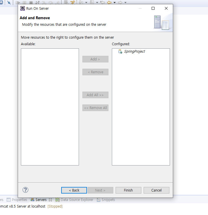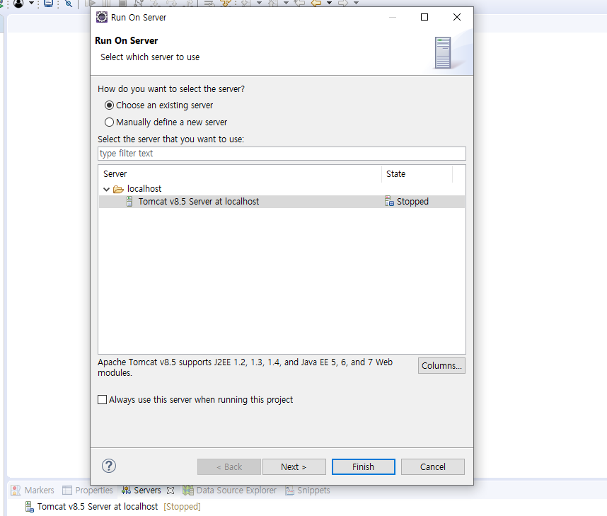생성된 프로젝트 우클릭 후 Rus As > Run on Server 실행