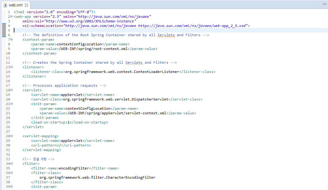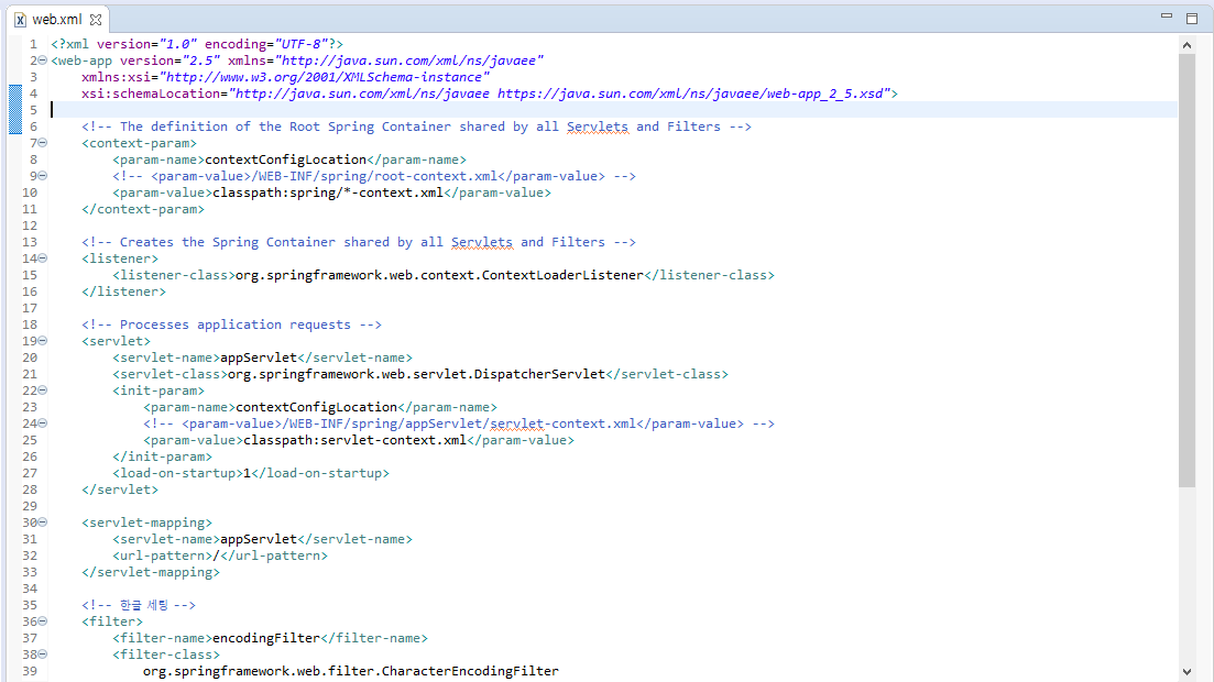 | // content 수정 <context-param> <param-name>contextConfigLocation</param-name> <param-value>classpath:spring/*-context.xml</param-value> </context-param> // servlet 수정 <servlet> <servlet-name>appServlet</servlet-name> <servlet-class>org.springframework.web.servlet.DispatcherServlet</servlet-class> <init-param> <param-name>contextConfigLocation</param-name> <param-value>classpath:servlet-context.xml</param-value> </init-param> <load-on-startup>1</load-on-startup> </servlet> |