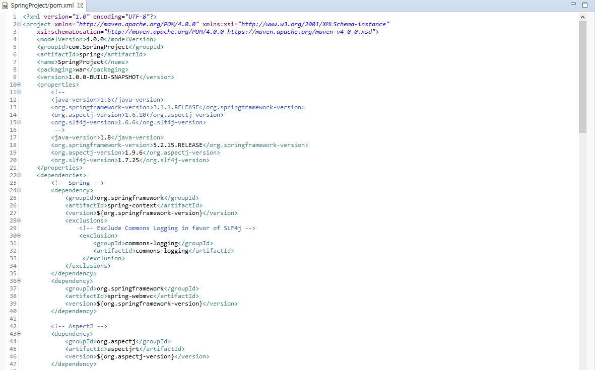 | <java-version>1.6</java-version> <org.springframework-version>3.1.1.RELEASE</org.springframework-version> <org.aspectj-version>1.6.10</org.aspectj-version> <org.slf4j-version>1.6.6</org.slf4j-version> <groupId>log4j</groupId><artifactId>log4j</artifactId><version>1.2.15</version> <groupId>javax.inject</groupId><artifactId>javax.inject</artifactId><version>1</version> <groupId>javax.servlet</groupId><artifactId>servlet-api</artifactId><version>2.5</version> <groupId>javax.servlet.jsp</groupId><artifactId>jsp-api</artifactId><version>2.1</version> <groupId>javax.servlet</groupId><artifactId>jstl</artifactId><version>1.2</version> <groupId>junit</groupId><artifactId>junit</artifactId><version>4.7</version> |