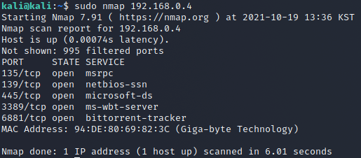 이처럼 Nmap을 통해서 각 PC에 열린포트, MAC Address등의 다양한 정보를 가져올 수 있다.